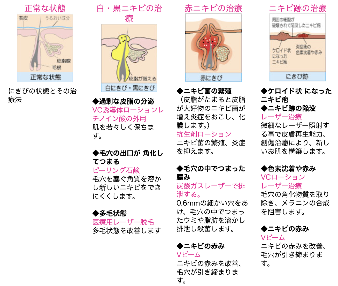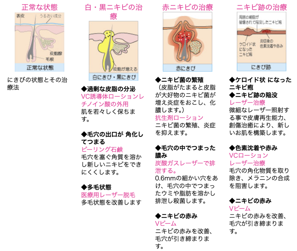 治療法: 抗生剤ローションで菌の繁殖を抑えます。また、必要に応じて「炭酸ガスレーザー」で0.6mmの細かい穴をあけ、毛穴に詰まった膿や脂肪を綺麗に排泄・殺菌し、「Vビーム」でニキビの赤みを改善します。