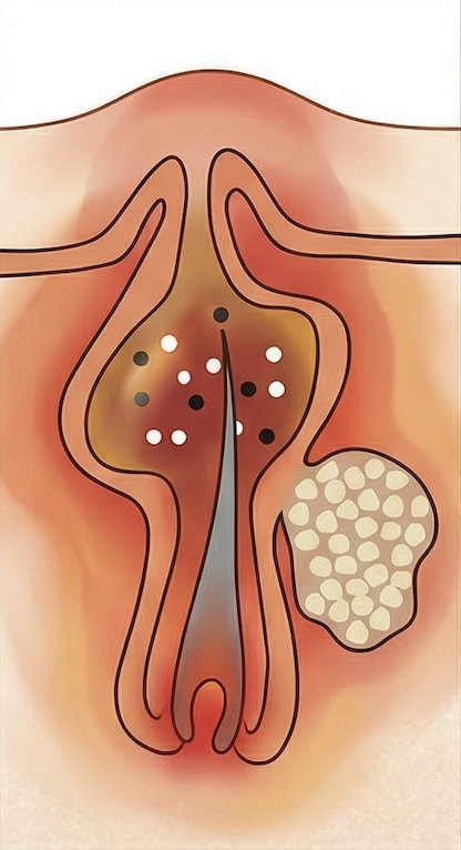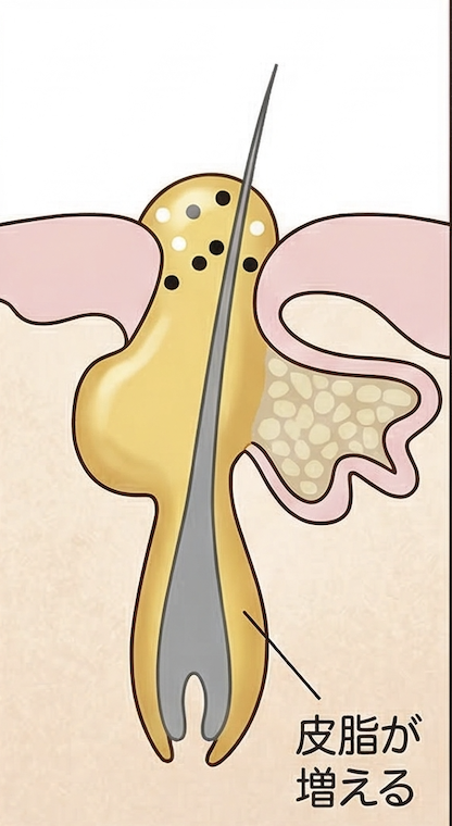 状態: 溜まった皮脂をエサにしてニキビ菌が繁殖し、炎症を起こしている状態です。