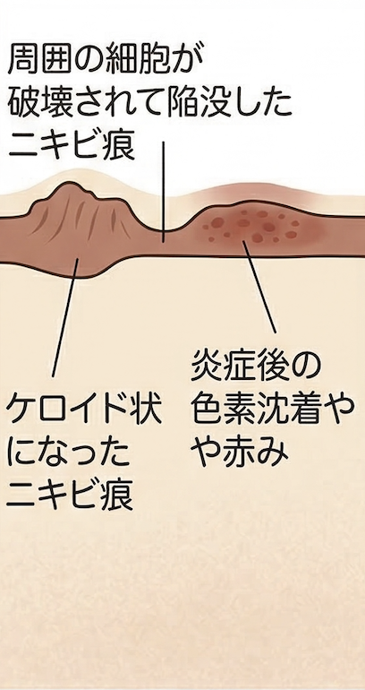 状態: ニキビが治った後に残るクレーター状の凹みや、赤み・茶色いシミです。