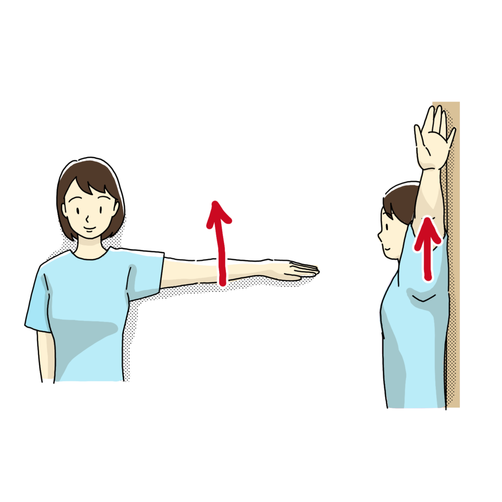 壁に沿わせながら、腕を上方へゆっくり万歳するようにスライドさせます。