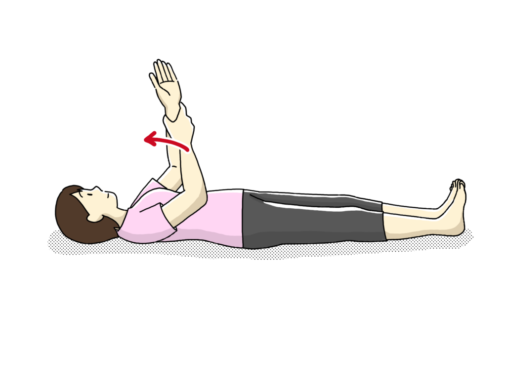 仰向けに寝た状態で、痛い方の腕を、反対側(健側)の手で下から支えます。