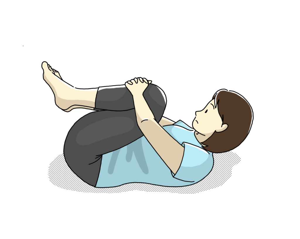 仰向けに寝た状態で、両膝を曲げて胸に近づけます。