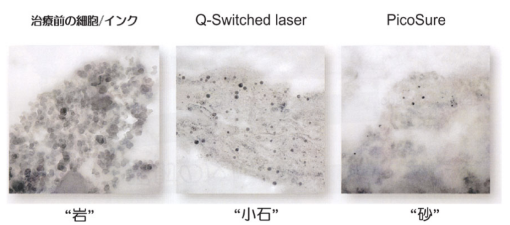 熱ではなく「光の衝撃波」でインクの粒子を微細なパウダー状に粉砕します。細かく砕かれたインクは、身体の免疫機能(マクロファージ)によって体外へ排出されやすくなるため、より早く色が薄くなります。